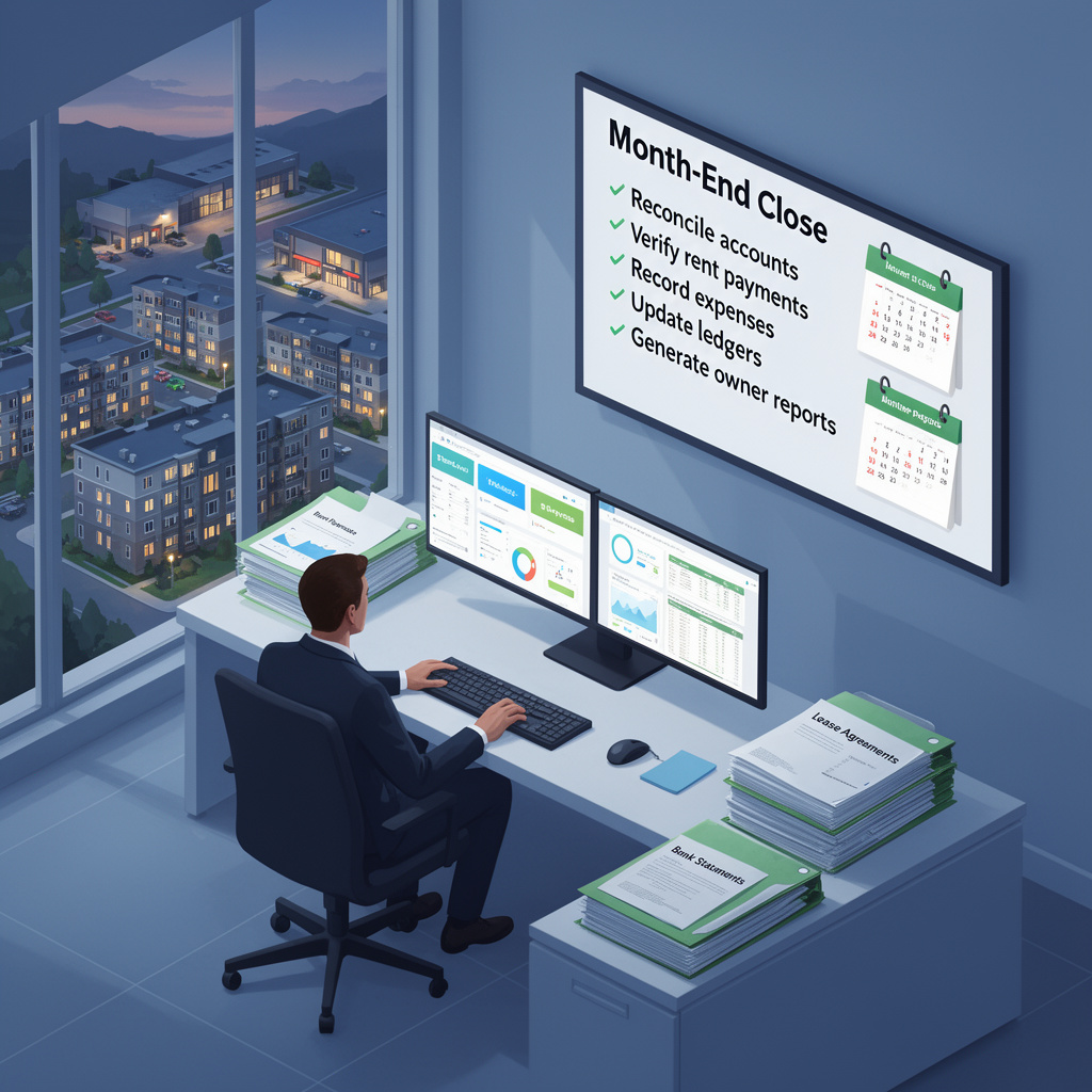 Month-end close is the process of reconciling accounts, recording accruals, reviewing income and expenses, and generating accurate owner financial reports at the end of each month.